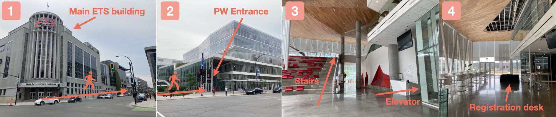 The images below show how to get to the PW39 conference room. If you Google “ETS”, it will take you to the main building of the university (1). You need to walk about 200 meters to get to the building called “Maison des étudiants” (2). Enter the building and either climb the stairs or take the elevator on the right to reach the second floor(3). From there, you should easily find the registration desk. The conference room for PW39 is right beside.